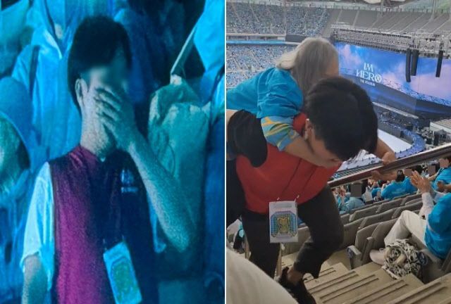[이데일리 박지혜 기자] 가수 임영웅의 공연이 열리는 서울월드컵경기장에서 거동이 불편한 관객을 업고 자리까지 안내해 준 진행요원이 화제다.