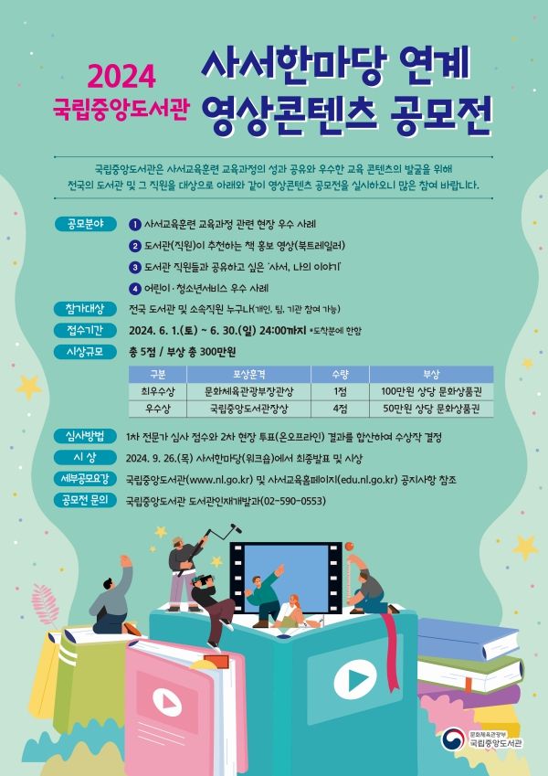 국립중앙도서관이 오는 6월 1일부터 6월 30일까지 전국 도서관 및 소속 직원을 대상으로 '2024년도 사서한마당 연계 영상콘텐츠 공모전'의 참가작을 접수한다.