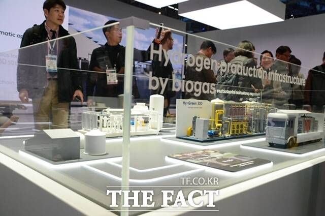 지난 1월 9일(현지 시간) 미국 라스베이거스 컨벤션센터(LVCC) 웨스트홀에서 개최된 '국제전자제품박람회 2024(CES 2024)' 현대차 전시관에 현대건설과 현대로템의 W2H 공정 실증 기술은 디오라마로 전시돼 있는 모습. 바이오가스를 수집하고 수소를 생산해 탄소를 포집하고, 수소충전소까지 운반하는 전반의 과정과 핵심 사항을 확인할 수 있다. /김태환 기자