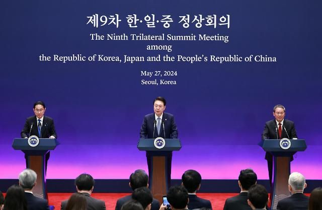 27日,在青瓦台迎宾馆,韩国总统尹锡悦、中国国务院总理李强和日本首相岸田文雄出席第九次韩中日领导人会议,并在会后共同会见记者。