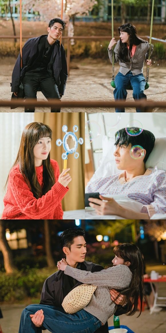 이런 가운데 공개된 사진 속에는 한껏 놀다가 열이 오른 아이처럼 양 뺨을 붉게 물들인 서지환과 그런 그를 귀엽다는 듯이 보는 고은하의 모습이 설렘을 유발한다. 또 고은하가 불어주는 비눗방울을 초롱초롱하게 바라보는 서지환의 눈빛에서는 순수함이 느껴진다. 또 서지환의 목에 팔을 두르고 얌전히 안긴 고은하의 표정에는 묘한 떨림이 묻어나 서로에게 푹 빠질 두 사람의 이야기가 기대를 모은다.