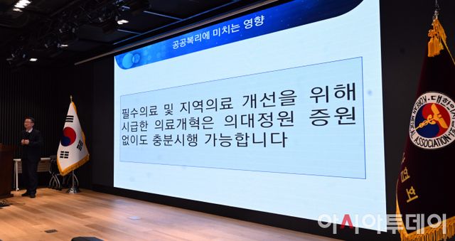 아시아투데이 박성일 기자 = 오세옥 부산대의대 교수협의회장이 27일 오전 서울 용산구 대한의사협회에서 열린 의학교육 파국 저지를 위한 공동 기자회견에서 참석해 급격한 의대증원의 부당성을 설명하고 있다.