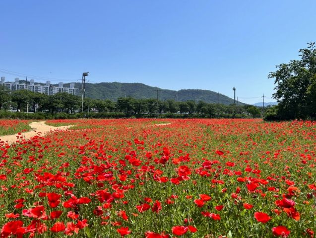 만개한 꽃양귀비는 화려한 붉은색 꽃을 피우며, 그 화려한 자태로 관광객들에게 인기 있는 꽃이다.
