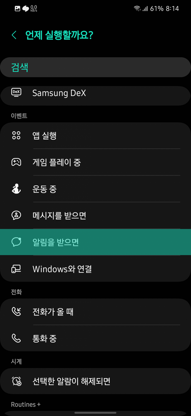1. 갤럭시 설정에서 루틴을 건색해서 루틴 기능으로 ㄱㄱ
