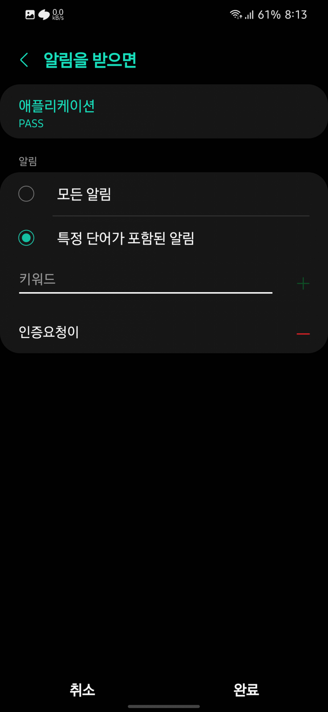 4. 앱을 PASS 앱으로 지정하고 문구 조건에”인증요청이”를 추가한다