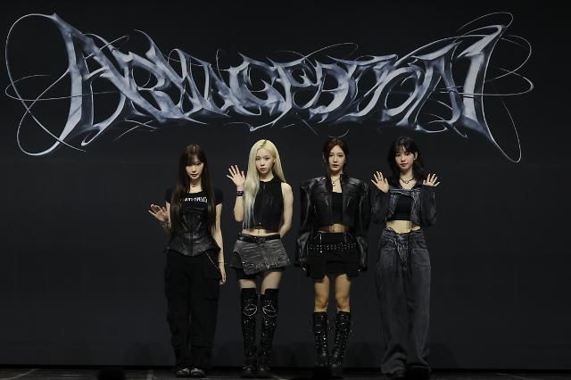 27日,女团aespa在首尔龙山举行首张正规专辑《Armageddon》发行会。【图片提供 韩联社】