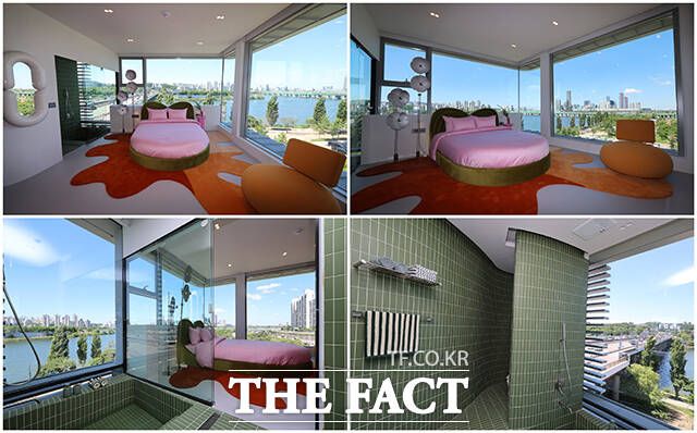 침실 남서쪽에 큰 통창을 설치해 노들섬에서 여의도까지 이어지는 한강의 전경을 한눈에 즐길 수 있는 것이 특징이다. 거실은 한강 변의 풍광에 영감을 받아 다채로운 색감을 활용한 디자인을 담아냈고, 천장은 유리로 마감해 도시 야경과 하늘을 올려다볼 수 있도록 했다.