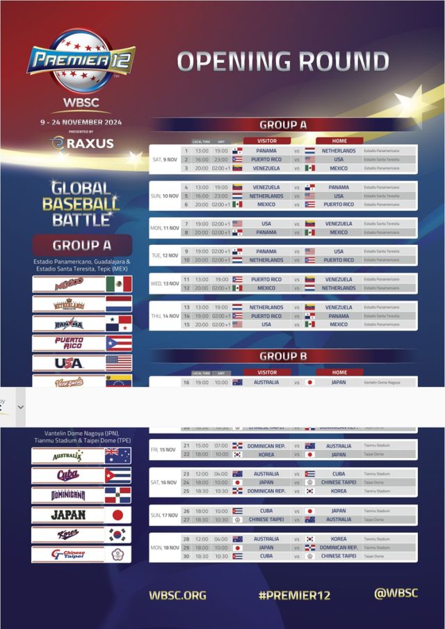 WBSC는 29일(한국시간) 2024 프리미어 12의 A, B조 일정을 공식 발표했다. 한국은 B조에 속한다.