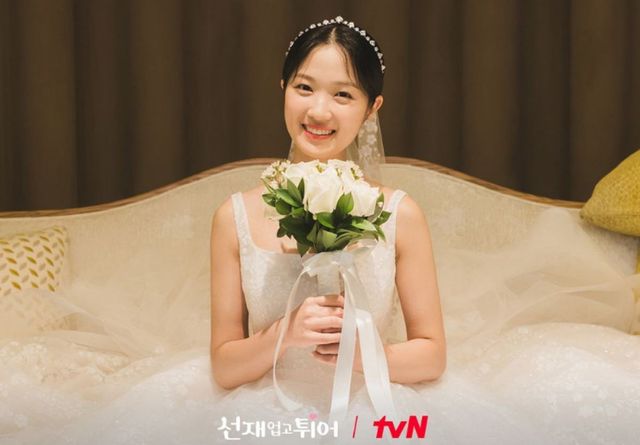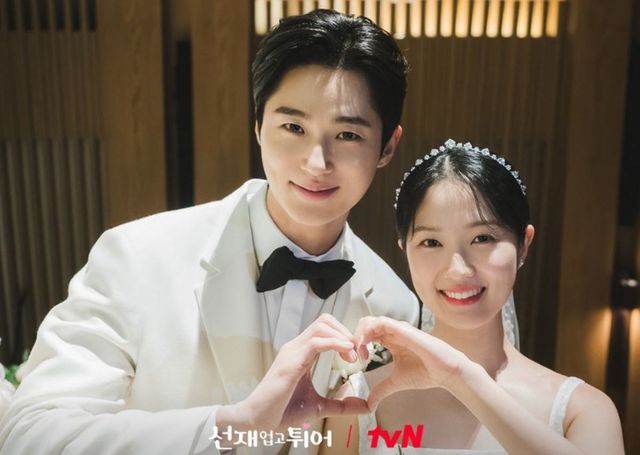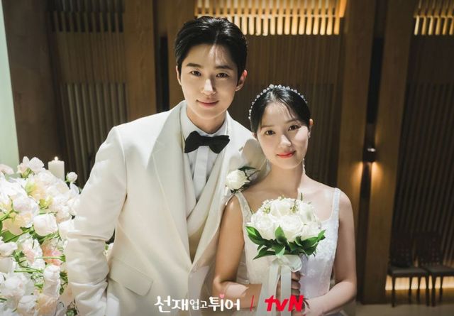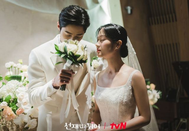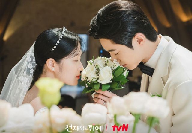 tvN 측이 공개한 사진에는 '선재 업고 튀어' 주인공인 류선재(변우석)와 임솔(김혜윤)의 결혼식 현장이 담겨있다. 류선재와 임솔은 카메라를 향해 행복한 미소를 짓거나 하트 포즈를 취하거나 부케에 코를 맞대는 등 사랑에 빠진 커플의 모습을 마음껏 보여줬다.