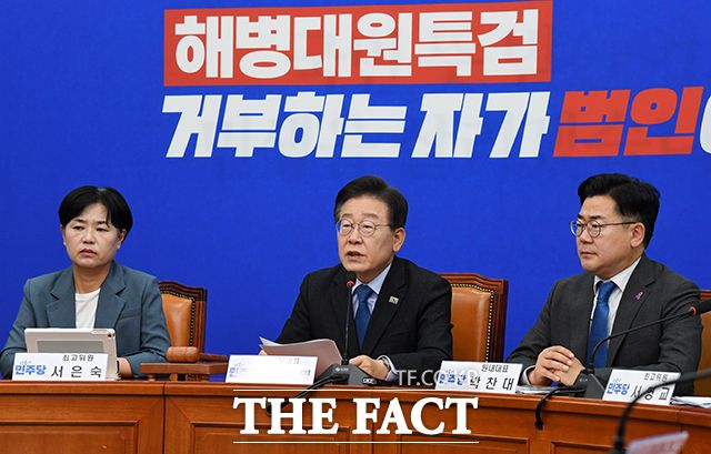 이재명 더불어민주당 대표(가운데)가 29일 오전 서울 여의도 국회에서 열린 최고위원회의에 참석해 모두발언을 하고 있다. /배정한 기자