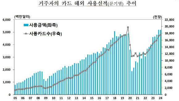거주자의 분기별 카드 해외 사용 실적 추이 [그래프=한국은행]
