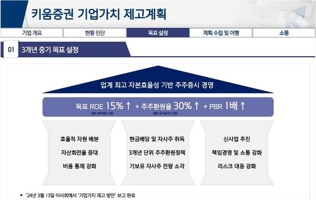 계획에 따르면 키움증권은 3개년 중기 목표로 자기자본이익률(ROE) 15% 이상, 주주환원율 30% 이상, PBR 1배 이상을 제시했다.