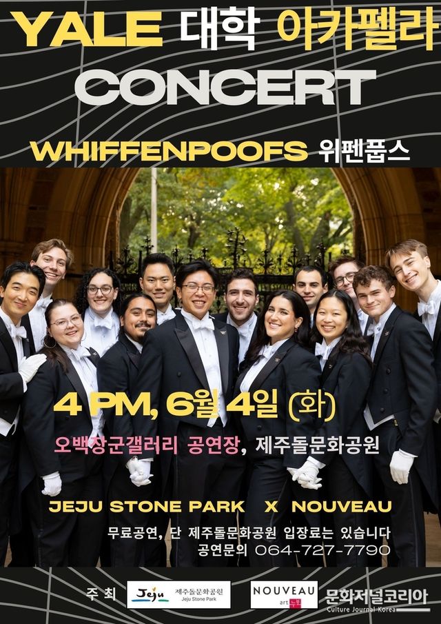 문화저널코리아 오형석 기자 | 미국 예일대학교 아카펠라 그룹 ‘위펜풉스(Whiffenpoofs)가 오는 6월 4일(화) 오후 4시 제주돌문화공원 오백장군갤러리 공연장에서 공연을 펼친다. 이번 공연은 제주돌문화공원(소장 김동희)과 공간 누보(대표 송정희)가 공동으로 진행하는 행사다.