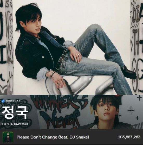 스포티파이에 따르면, 지난해 11월 방탄소년단(BTS) 정국이 발매한 첫 솔로 앨범 'GOLDEN'의 수록곡 'Please Don't Change'가 최근 1억 스트리밍을 돌파했다.