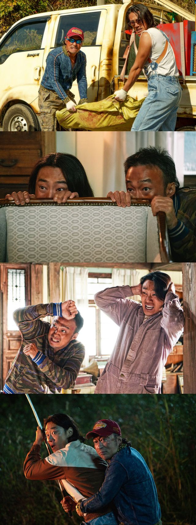 공개된 첫 번째 스틸은 드림하우스 입주를 위해 새로운 곳으로 이사를 온 재필(이성민 분)과 상구(이희준 분)의 일하는 모습을 담고 있다. 뙤약볕 아래 땀을 흘리며 열심히 일하는 두 남자의 모습은 험상궂은 비주얼과 사나운 표정이 더해져 열혈 경찰 최 소장(박지환 분)의 의심을 불러일으킨다. 특히 그들이 힘을 합쳐 들어 올리는 의문의 포대자루와, 자루를 뚫고 나온 붉은 자국은 오싹함을 전해 궁금증을 자극한다. 여기에 마치 데칼코마니처럼 포즈와 표정이 똑같아서 더욱 웃음을 자아낸다. 이어지는 스틸은 마치 복사하기, 붙여넣기를 한 것처럼 동일화 되어 있는 포즈가 폭소를 유발한다. 무언가를 보고 겁에 질린 듯 소파 뒤에 커다란 덩치를 숨기고 눈만 내놓은 모습부터 두려운 것으로부터 방어 자세를 펼치는 것까지 똑같아 재필과 상구의 일심동체 케미를 기대케 한다. 마지막은 밤낚시를 하다 무언가를 발견한 둘의 모습을 담아냈다. 으슥한 밤, 깜짝 놀라 토끼 눈이 된 상구와 그런 상구를 지켜주려는 듯한 자세를 취한 재필의 모습은 형제 이상의 케미를 전한다. 동시에 험상궂은 비주얼의 두 남자가 찰싹 달라붙어 겁을 먹은 듯한 순간을 포착해 그들이 목격한 무언가의 정체에 더욱 호기심을 불러일으킨다. 함께해서 더욱 압도적인 시너지를 뿜어내는 재필과 상구의 모습에 남동협 감독은 “홍콩에 주성치, 오맹달이 있다면 한국에는 이성민, 이희준 표 코미디가 있다는 것을 직접 확인할 수 있을 것”이라며 극강의 케미를 예고해 둘의 맹활약에 대한 기대감을 더욱 고조시킨다.