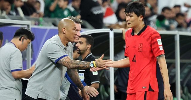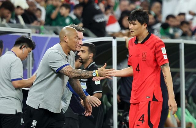 지난 1월 30일(현지 시각) 카타르 알라이얀 에듀케이션 시티 스타디움에서 열린 2023 아시아축구연맹(AFC) 카타르 아시안컵 16강전 대한민국과 사우디아라비아의 경기에서 김민재가 연장 후반 교체아웃되며 차두리 코치와 인사하고 있다. / 뉴스1