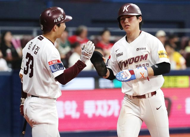 지난 17일 오후 서울 고척스카이돔에서 열린 프로야구 2024 신한은행 SOL뱅크 KBO리그 SSG 랜더스와 키움 히어로즈의 경기 1회 말 2사 1루 상황 키움 이주형의 안타 때 득점한 김혜성이 김휘집과 하이 파이브를 나누고 있다. / 뉴스1