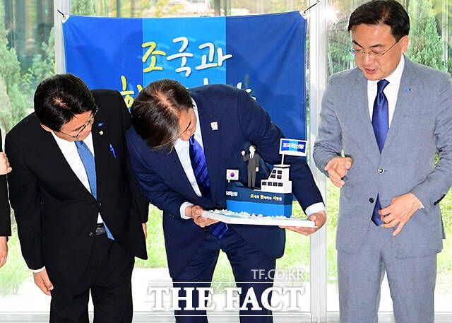 지지자들이 준비한 선물 둘러보는 조국 대표(왼쪽 세번째).