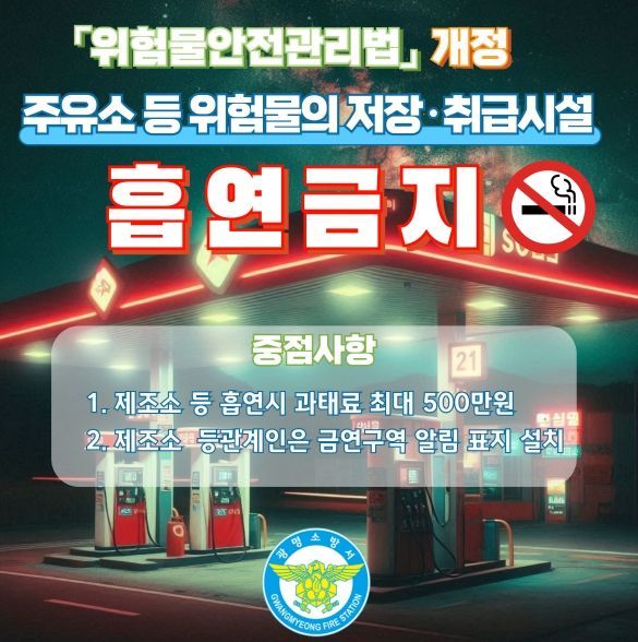 [와이뉴스] 광명소방서는 '위험물안전관리법' 개정(‘24.1.30.)에 따라서 주유소 등 위험물의 저장·취급 시설에서의 ‘흡연 금지’를 당부했다.
