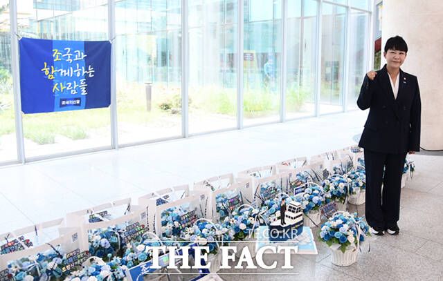 제22대 국회 개원일인 30일 오전 서울 여의도 국회 소통관에서 조국 조국혁신당 대표 지지자들이 등원 축하 선물을 준비한 채 의원들을 맞이하고 있다.