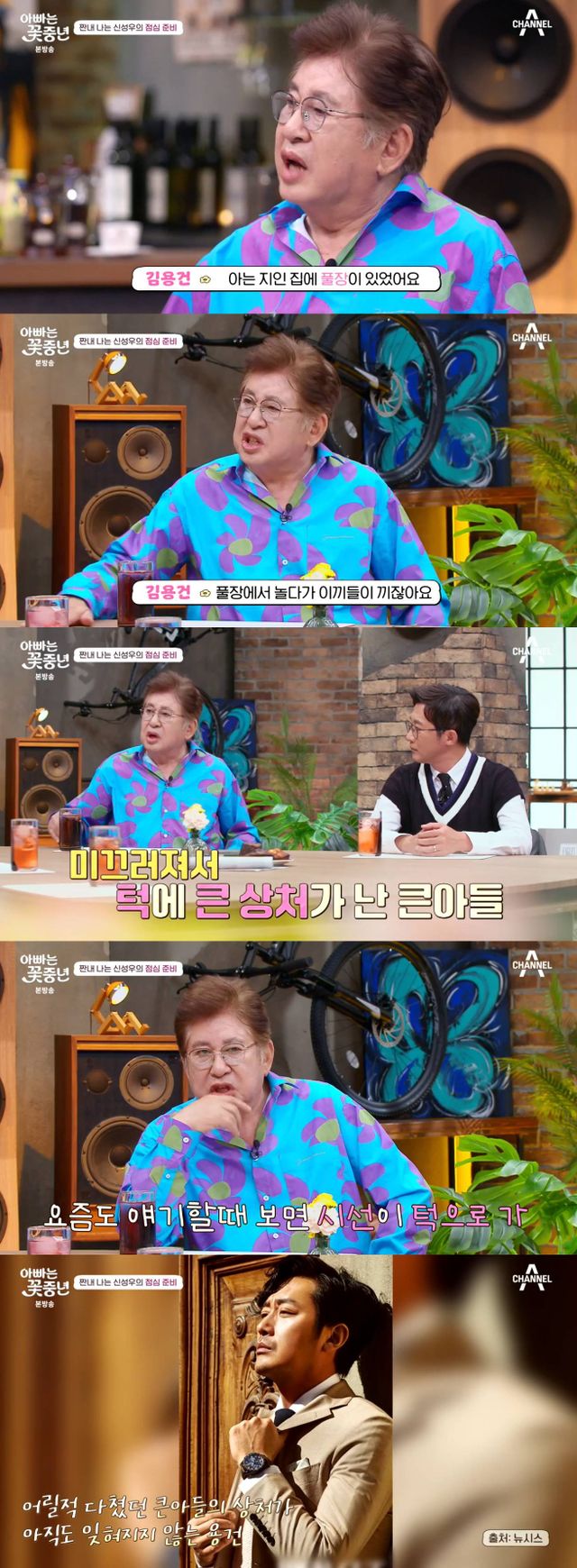 이날 방송에서 김용건은 하정우가 어렸을 때 다쳤던 일화를 전했다. 그는 "애들 조금이라도 다치면 속상하다. 큰애가 5살 때 아는 지인 풀장에 갔다. 풀장에 이끼들이 끼는데 미끄러져서 턱이 쫙 갈라졌다. 병원을 찾아다니는데 주말에. 그때 정말 속상하더라"라며 당시를 회상했다.