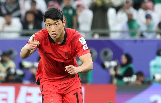 2024년 1월 30일(현지 시각) 카타르 알라이얀 에듀케이션 시티 스타디움에서 열린 2023 아시아축구연맹(AFC) 카타르 아시안컵 16강전 대한민국과 사우디아라비아의 경기에서 황희찬이 승부차기 네 번째 키커로 나서 성공한 후 기뻐하고 있다. / 뉴스1