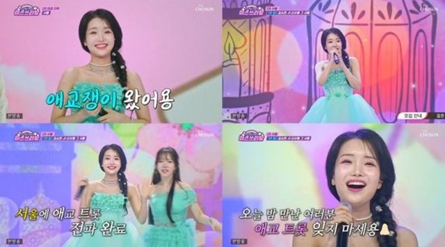 이날 김소연은 미(美) 팀 대표로 출전했다. 민트색 미니 원피스를 입고 깜찍한 매력을 드러낸 김소연은 '애교 트롯' 창시자다운 긍정 에너지로 남다른 예능감을 발산했다.