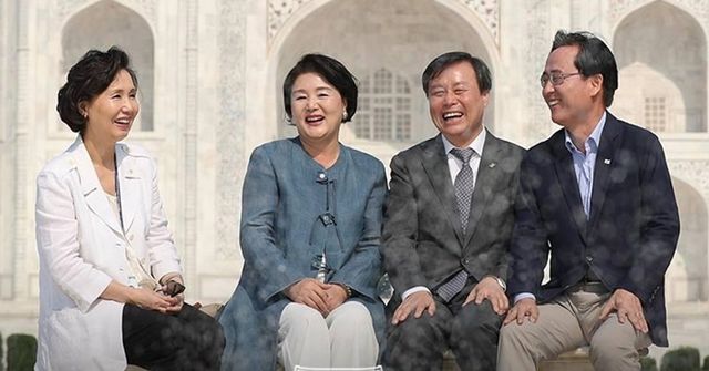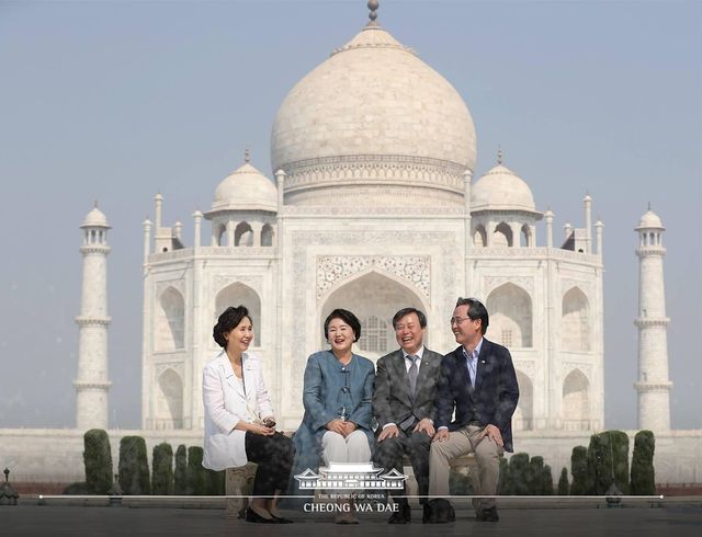 문재인 대통령의 부인 김정숙 여사(왼쪽에서 두 번째)가 지난 2018년 11월7일(현지 시각) 인도 우타르프라데시주 아그라의 타지마할을 둘러보고 있다. / 청와대 페이스북