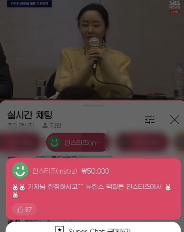 특히 이날 민희진의 기자회견은 많은 언론사의 라이브 방송을 통해 송출됐는데 다소 이례적인 상황이 포착됐다. 기자회견을 시청하는 수많은 시청자 수를 이용해 자사 제품 등을 광고하는 이들이 다수 등장한 것이다. 이들은 유튜브 채널에 돈을 후원하는 기능인 '슈퍼챗'을 활용해 기자회견 라이브를 '가성비 광고창'으로 썼다.