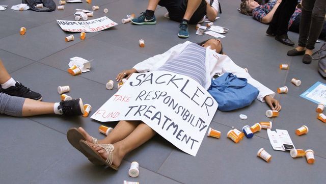 골딘은 자신의 경험을 바탕으로 사회단체 P.A.I.N(처방 중독 즉각 개입)을 설립한 뒤 마약성 진통제를 판매하며 남용을 유도한 제약사 퍼듀 파마와의 투쟁에 들어갔다. 퍼듀를 소유한 유력 가문 새클러도 표적이 된다. 생전 유명한 미술애호가로 알려진 아서 새클러의 기부금으로 운영되던 메트로폴리탄, 구겐하임, 루브르 같은 유명 기관에서 새클러라는 이름을 지울 것을, 같은 공간에 작품이 영구소장되어 있는 예술가이자 운동가 골딘이 강력하게 주장하고 나선 것이다. 전단지를 뿌리고 약병을 던지고 바닥에 눕고 큰 소리로 외친 P.A.I.N 덕에 4년 만에 메트로폴리탄을 비롯한 유수의 기관에서 새클러의 이름을 지울 수 있었다. 퍼듀는 파산했고 유죄도 인정되었다. 그 어떤 정치가나 사법기관도 이루지 못한 업적이다.