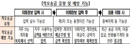 향후 모바일 앱의 이체시스템이 개선되면, 금융회사에 따라 착오송금 예방 기능들이 구현되는 조건은 상이[ 예시) A은행은 30만원 초과 이체 시에만 ‘최근 송금 이력 없음’을 경고하고, B머니는 1분 이내인 경우에만 ‘이중 입금’ 경고하는 등 일부 다른 조건으로 예방 기능이 활성화]할 수 있지만 착오송금 발생 가능성이 많이 감소될 것으로 기대하고 있다.