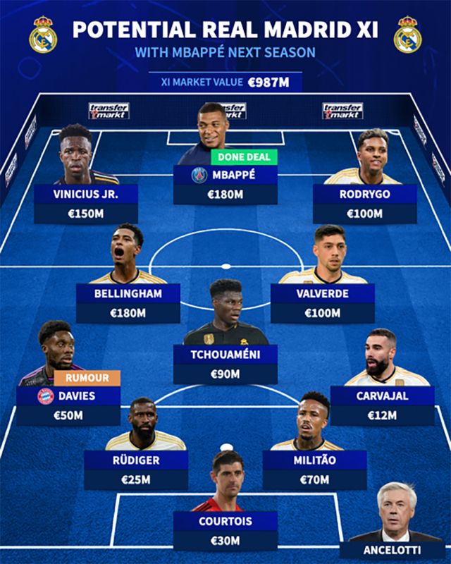뿐만 아니라 1억 8000만 유로(약 2700억원)로 음바페와 시장가치가 같은 주드 벨링엄을 중심으로 페데리코 발베르데, 오렐리앙 추아메니가 포진하는 중원 역시도 더없이 화려하다. 영입설이 돌고 있는 알폰소 데이비스(바이에른 뮌헨)가 왼쪽 측면 수비수로 나서고 안토니오 뤼디거, 에데르 밀리탕, 다니 카르바할이 수미라인, 티보 쿠르투아가 골문을 각각 지킬 것이라는 게 트랜스퍼마르크트의 전망이다. 예상 선발 라인업 11명의 몸값만 9억 8700만 유로(약 1조 4800억원)에 달한다. 수비진 보강이 더 이뤄지게 되면 몸값은 10억 유로를 넘어설 전망이다.