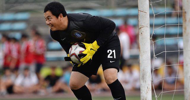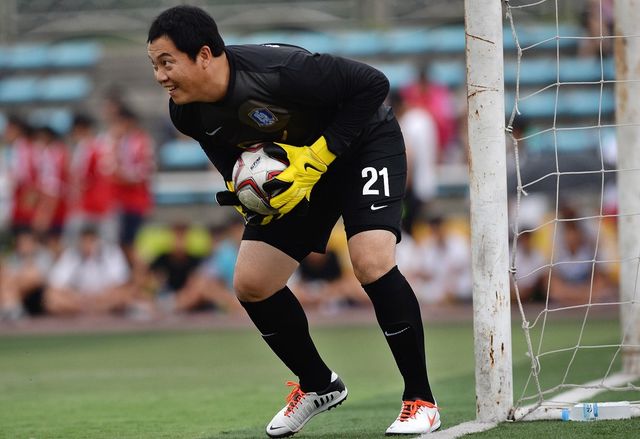 2013년 7월 30일 오후 경기도 남양주시 이패동 남양주종합운동장에서 열린 2013 유·청소년 축구대회 (I-리그) 개막 행사인 축구 전 국가대표 올스타와 연예인 축구단의 친선경기에서 백팀 이운재가 골을 막아내고 있다. / 뉴스1