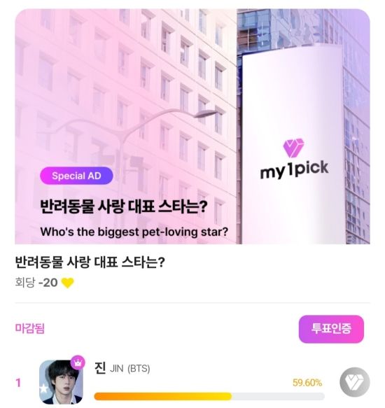 '마이원픽'(MY1PICK)은 5월 27일부터 5월 31일까지 "반려동물 사랑 대표 스타" 투표에서 방탄소년단(BTS) 진이 1위에 올랐다고 밝혔다.