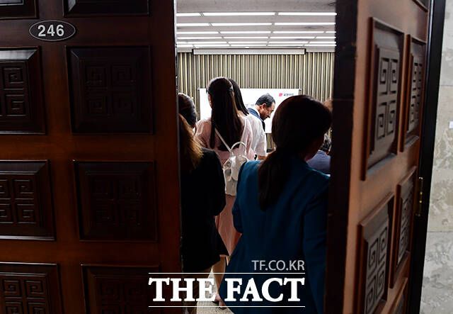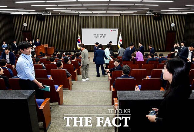 [더팩트ㅣ국회=배정한 기자] 제22대 국회 첫 본회의를 앞둔 5일 오전 서울 여의도 국회에서 국민의힘 의원들이 비공개 의원총회에 참석하고 있다.