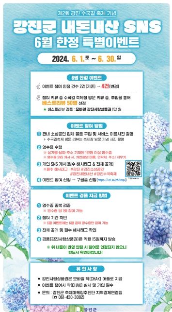 [파이낸셜경제=김예빈 기자] 강진군이 소상공인 살리기를 목적으로 진행 중인 ‘내돈내산 SNS 리뷰 이벤트‘를 제2회 강진 수국길축제를 기념해 6월 한달간 특별 이벤트로 진행한다고 밝혔다.