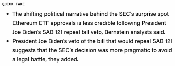 미국 투자은행인 번스타인(Bernstein)은 이번 주 고객서한에서 현지 행정부가 가상화폐 시장 관련 정치적 입장을 친화적으로 바꿨다는 주장은 신빙성이 떨어진다고 밝혔다. 만약 조 바이든 대통령이 가상화폐 시장 표심을 위해 움직였다면, 미국 이더리움 현물 상장지수펀드 승인 외에도 결의안을 통과시키는 식으로 업계 부양 의지를 드러냈을 것이라는 시각이다.