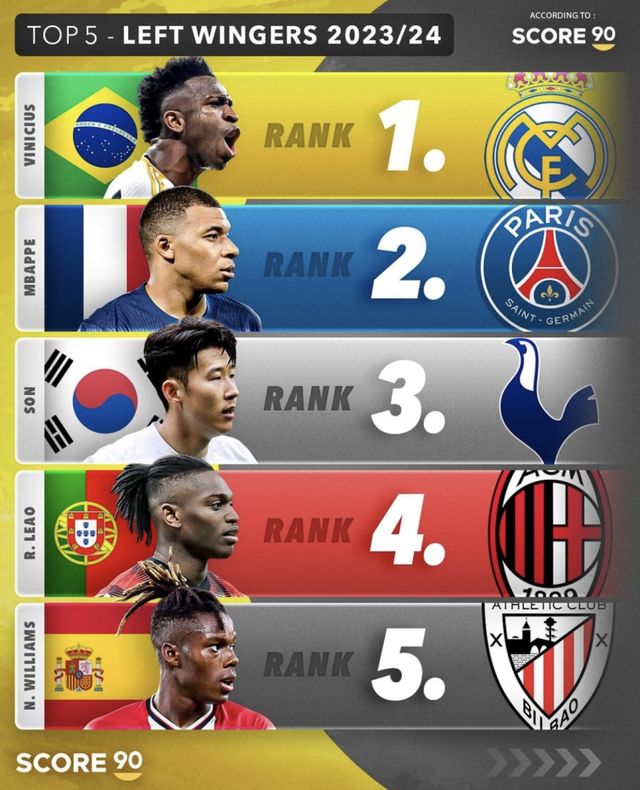 손흥민은 왼쪽 윙어 부문 3위를 차지했다. 레알 마드리드 듀오인 비니시우스 주니오르, 킬리안 음바페만이 그의 위에 자리했다. 사실상 음바페가 중앙 공격수로도 자주 분류된다는 것을 고려하면, 비니시우스 다음으로 인정을 받은 것이다.