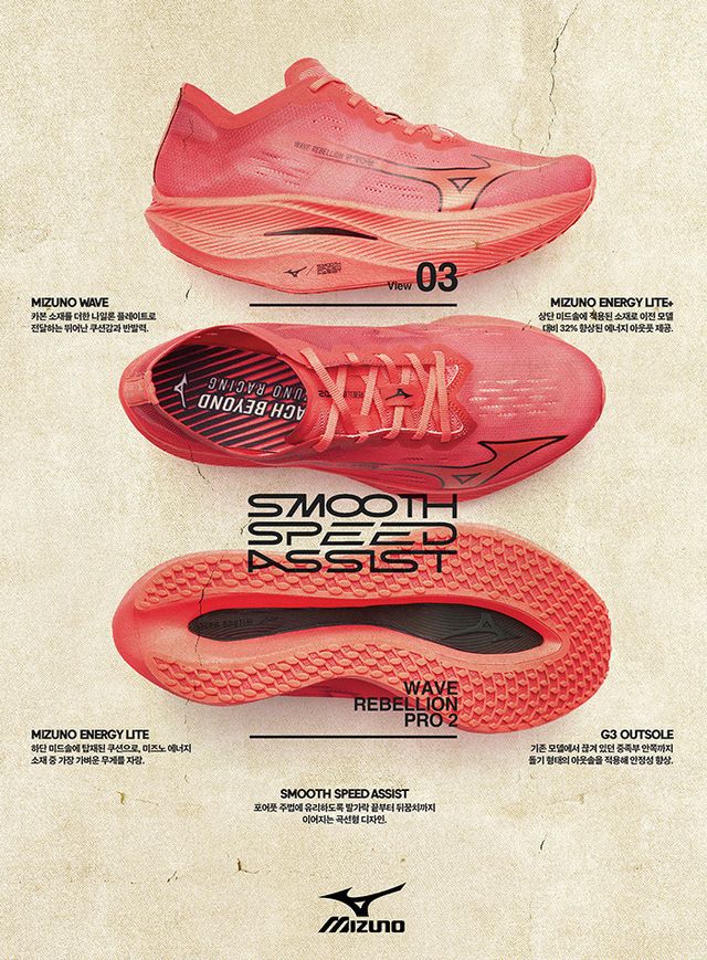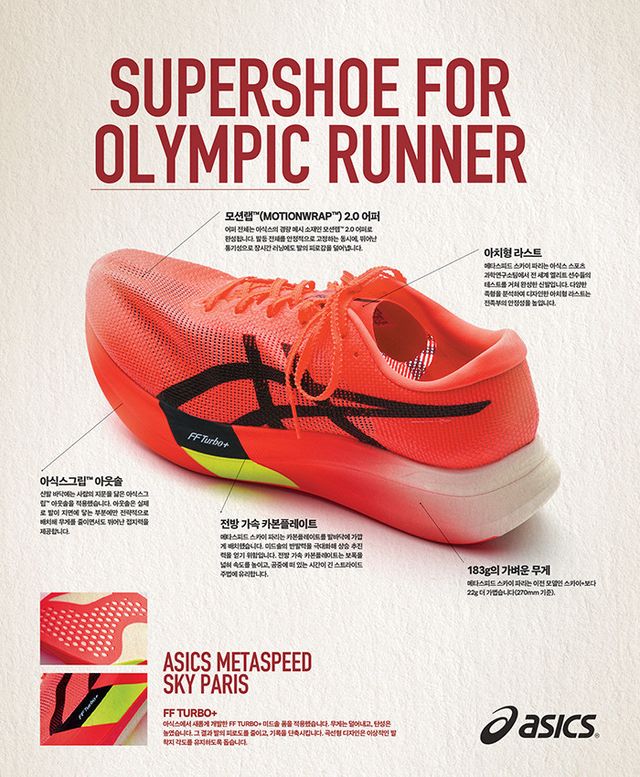 아식스 최초의 마라톤화는 1953년에 나왔다. 러닝화 시장에서 아식스가 특별히 두각을 나타내온 것도 70년 넘게쌓 아온 노하우 덕분이다. 아식스의 최신 러닝화 메타스피드는 러닝 주법에 따라 유리하도록 스카이파리(스트라이드), 엣지 파리(케이던스) 두가 지로 출시된다.2024년 06월호