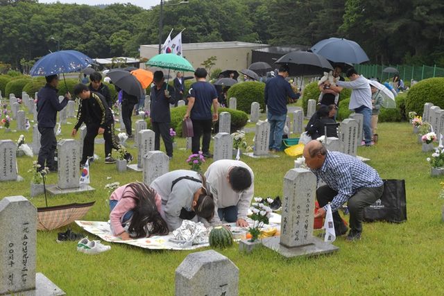 제69회 현충일인 6일 국립제주호국원에는 비날씨에도 참배객들의 발길이 이어졌다. 이상국기자