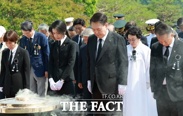 윤석열 대통령과 부인 김건희 여사가 6일 서울 동작구 국립서울현충원에서 열린 제69회 현충일 추념식에 참석한 모습. 김 여사는 지난 3월 제105주년 3·1절 기념식에는 불참했었다. /뉴시스