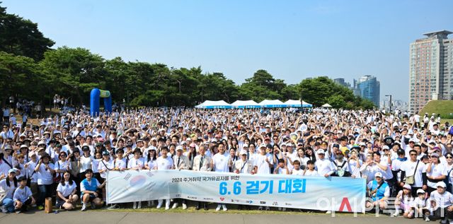 현충일인 6일 오전 서울 중구 남산공원 백범광장에서 열린 2024 주거취약 국가유공자를 위한 '6.6 걷기 대회'에서 오세훈 서울시장과 6.25 참전용사, 시민들이 출발에 앞서 기념촬영을 하고 있다. /정재훈 기자