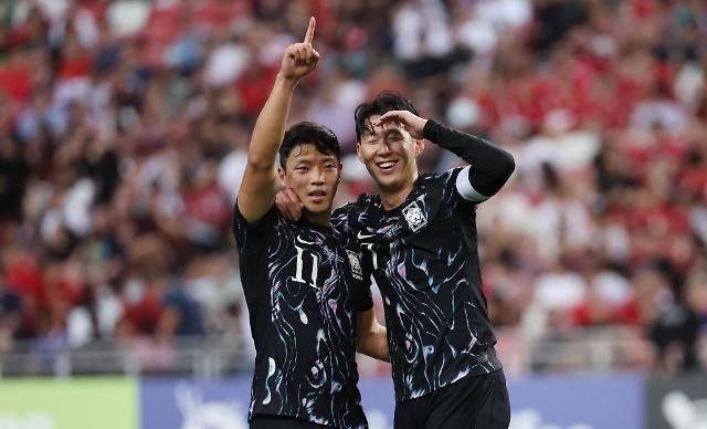 6日晚,世预赛亚洲区第二阶段C组第5轮韩国队客场对阵新加坡队,最终7比0大胜锁定头名晋级,末轮将同中国足球队展开较量。图为孙兴慜和黄喜灿庆祝进球。
