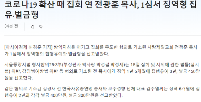 코로나 19 확산 때 불법 집회를 열었던 전광훈은