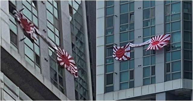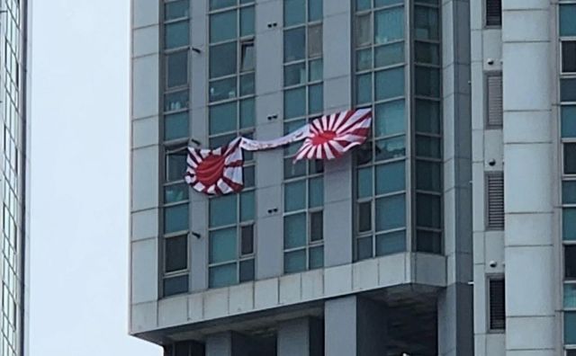 현재는 두 개의 욱일기 사이에 걸려 있던 '민관합동 사기극'이라는 문구가 적힌 현수막만 붙어 있는 것으로 알려졌다.