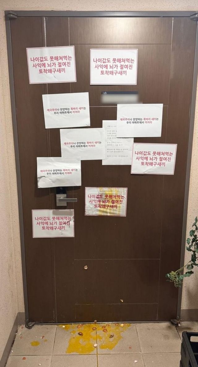 비난 글과 오물로 도배된 주민의 현관 앞. / 연합뉴스