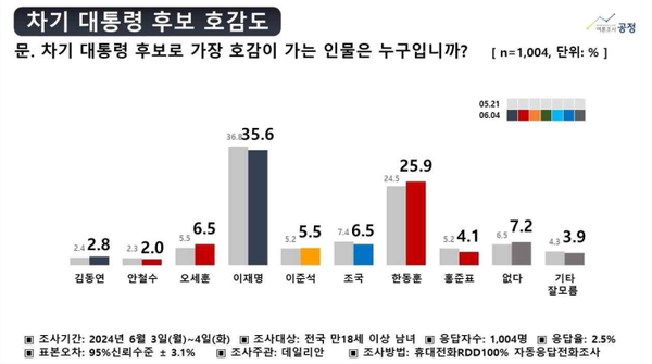 데일리안이 여론조사 전문기관 여론조사공정㈜에 의뢰해 지난 3~4일 '차기 대통령 후보로 가장 호감이 가는 인물'에 대한 설문을 진행한 결과, 이재명 대표는 35.6%, 한동훈 전 위원장은 25.9%로 나타났다.