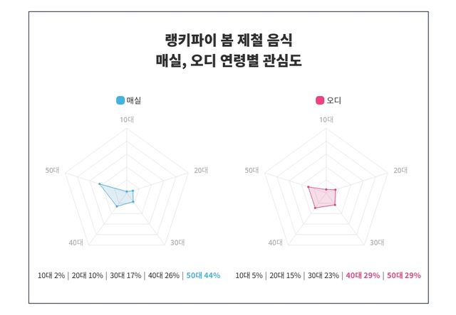 이어 오디는 40대에서 29%의 높은 관심도를 받는 것으로 나타났으며, 오디의 관심도는 10대 5%, 20대 15%, 30대 23%, 40대 29%, 50대 29% 순으로 확인되었다. 이는 두 트렌드가 세대별로 어떻게 관심을 받고 있는지를 나타낸다.