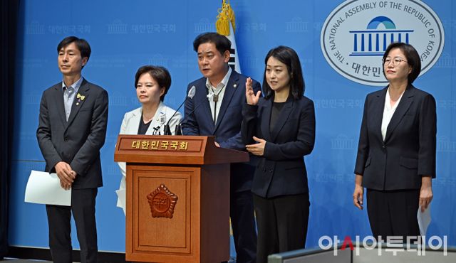 아시아투데이 송의주 기자 = 야 4당 초선의원들이 7일 국회 소통관에서 공동 기자회견을 열고 22대 국회 원 구성을 촉구하고 있다. 왼쪽부터 사회민주당 한창민·조국혁신당 정춘생·더불어민주당 윤종군 의원, 수화 통역사, 진보당 정혜경 의원.