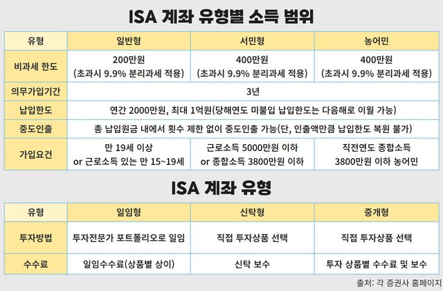 유형에 따라 계좌는 서민형·일반형·농어민으로 나뉜다. 서민형은 직전 연도 총급여 5000만원 또는 종합소득 3800만원 이하만 가입할 수 있다. 일반형은 만 19세 이상 또는 직전년도 근로소득이 있는 만 15~19세 미만 대한민국 거주자면 누구나 가입할 수 있다. 농어민은 직전연도 종합소득 3800만원 이하 농어민 대한민국 거주자가 대상이다. 소득 범위에 따라 ISA 계좌를 선택 발급할 수 있고 유형에 따라 비과세 한도도 다르다.